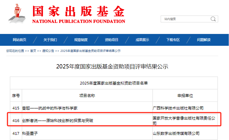 近日,國(guó)家出版基金規(guī)劃管理辦公室公示2025年度國(guó)家出版基金資助項(xiàng)目評(píng)審結(jié)果,國(guó)家開放大學(xué)院士講堂項(xiàng)目成果《創(chuàng)新者說(shuō)——原始科技創(chuàng)新的探索與突破》成功入選。