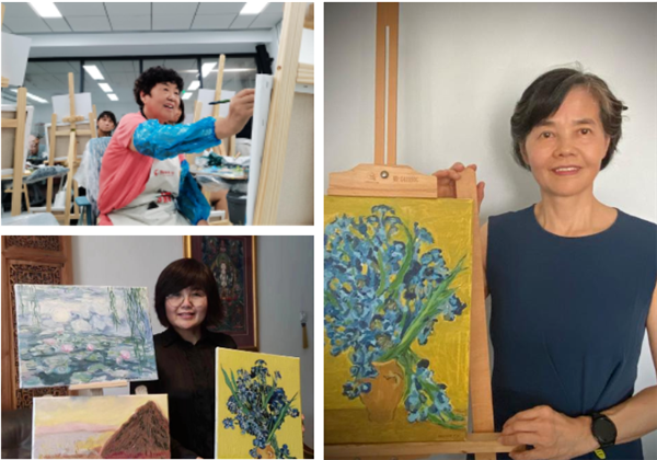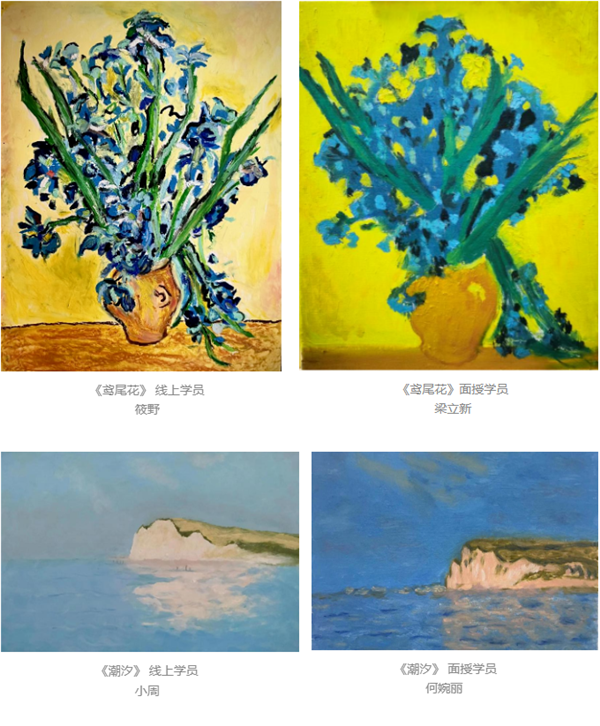 “零基礎(chǔ)油畫(huà)”線(xiàn)上線(xiàn)下融合班學(xué)員在學(xué)習(xí)期間學(xué)習(xí)了畫(huà)家思維的核心知識(shí),臨摹了梵高的《鳶尾花》,莫奈的《潮汐》、《睡蓮11》及《夕陽(yáng)中的干草堆》四幅作品。短短6周,學(xué)員們從油畫(huà)小白成為能夠臨摹大師名作的油畫(huà)高手。看著自己的作品,學(xué)員們感嘆融合班激發(fā)了他們的藝術(shù)潛力。部分學(xué)員作品還將在東盟經(jīng)濟(jì)文化交流中心的“在線(xiàn)油畫(huà)公社”作品展上展出。