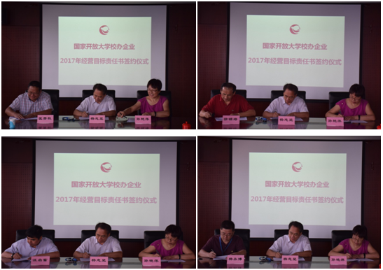 楊志堅校長代表主管單位會同資產管理公司總經理孫艷萍,分別與出版社、音像社、培訓中心、國開貝和等公司負責人簽署2017年經營目標責任書。