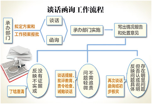 談話函詢——指通過談話、發(fā)函的形式對問題線索進(jìn)行處置的一種方式。適用談話函詢的線索,主要是反映的問題具有一般性,查清了只能給予輕處分或批評教育,或者反映問題不實(shí)而予以澄清的;反映問題籠統(tǒng),多為道聽途說或主觀臆測,難以查證核實(shí)的線索。