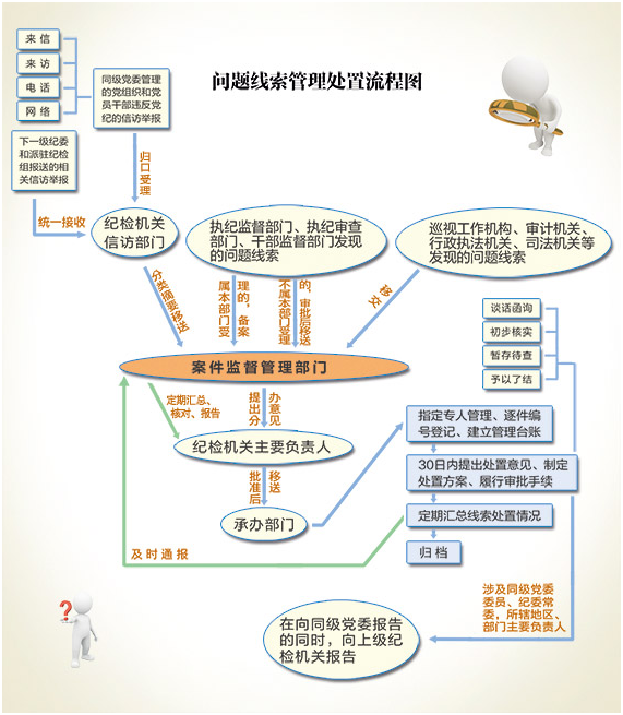 信訪舉報是問題線索的一大來源,但不是唯一。在紀檢機關內部,除信訪部門外,執紀監督部門、執紀審查部門、干部監督部門等都可能發現相關問題線索;在紀檢機關外部,黨委巡視巡察工作機構、審計機關、行政執法機關、司法機關等單位也會向紀檢機關移交相關問題線索。無論問題線索來自何處、由誰收到,千條線、萬條線,最后都要統一歸口到案件監督管理部門這“一根針”。